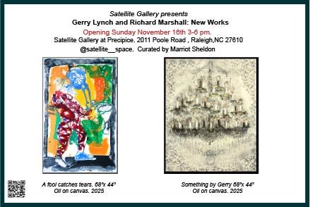 Lyrical beauty cleaves with and from deeper reality in “Gerry Lynch and Richard Marshall: New Works”, the enticing show opening in November at Satellite Gallery. From the whimsical, ethereal beauty in Gerry Lynch’s “Chandelier” Series to Richard Marshall’s meditations on death and desire highlighted by “Perspective Device”, these works present new avenues of brilliance from two of Raleigh’s most gifted artists. Marshall’s works punctuate his 40-year career, bringing an always brilliant use of color and technique to search again for the enigmatic truths hidden within plain sight. The seriousness of most Lynch paintings — a vast array of abstracts over decades as one of North Carolina’s most important artists — is here layered beneath her gently rendered chandeliers.